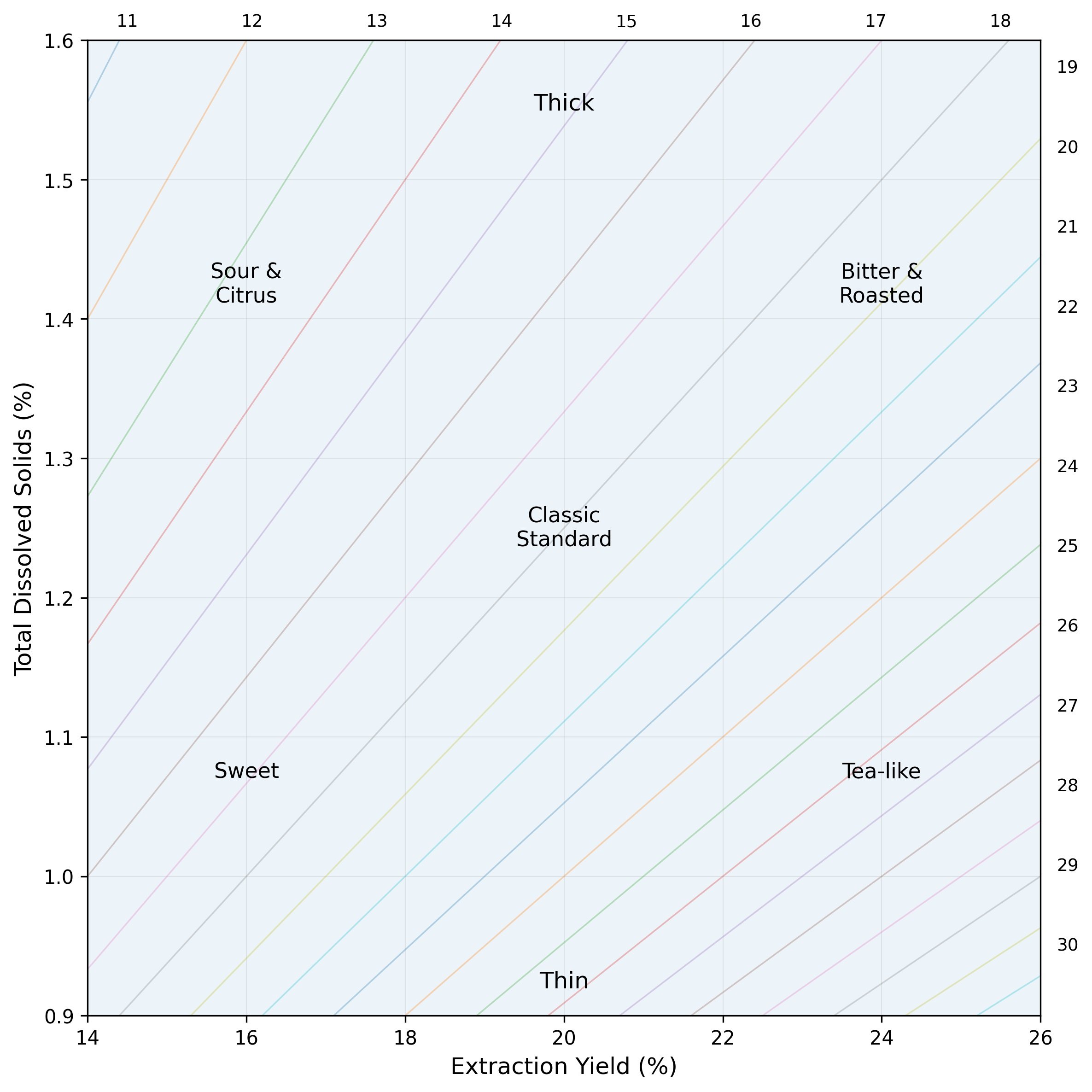 In 2023 the Specialty Coffee Association released an updated Brewing Control Chart based on research conducted at UC Davis. Unlike Lockhart’s original model, which defined a single “ideal” zone, the revised chart maps consumer preference across a wider range of extraction yields and brew strengths. The findings suggest that there is no universal sweet spot — rather, distinct clusters of preference exist. Some consumers favor higher strength and higher extraction brews with greater body and bitterness tolerance, while others prefer lower strength, sweeter, and more delicate cups.