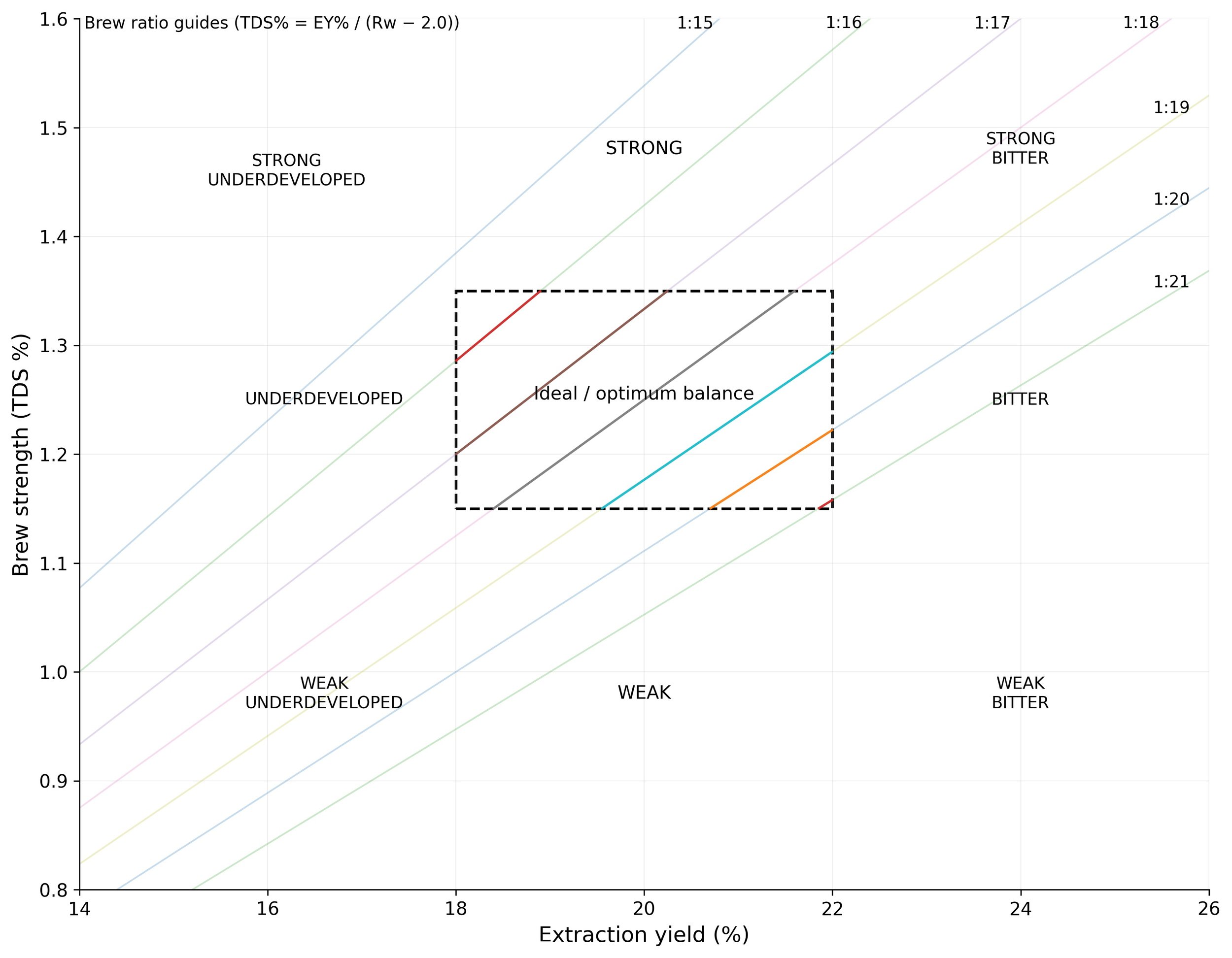 This foundational concept is the work of Dr. Ernest Earl Lockhart who designed the first Brewing Control Chart (1957) aimed at identifying consumer preferences and ideal filter coffee recipes. This chart recommends an extraction yield between 18 – 22% and a brew strength between 1.15 – 1.35%. In the chart below this is referred to as Ideal/Optimum Balance. To achieve these results would require certain coffee:water ratios (1:16 – 1:20). However, it reflects assumptions about roast style and consumer preference from a different era. The model described what people liked, not what coffee is capable of.